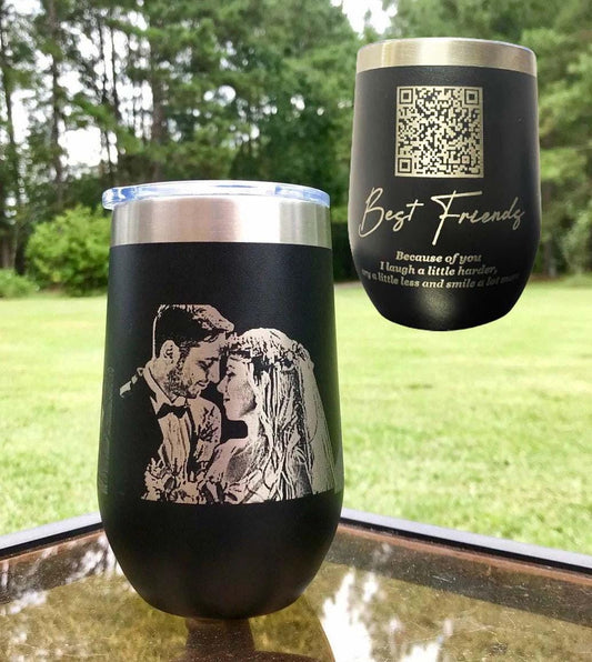 QR code and photo engraved Stainless Steel Wine Tumbler, Personalized Stemless Vacuum Insulated Double Wall, Powder Coated