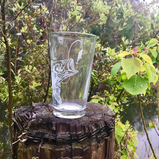 Engraved Big mouth bass fishing lure pint glass, Beer mug