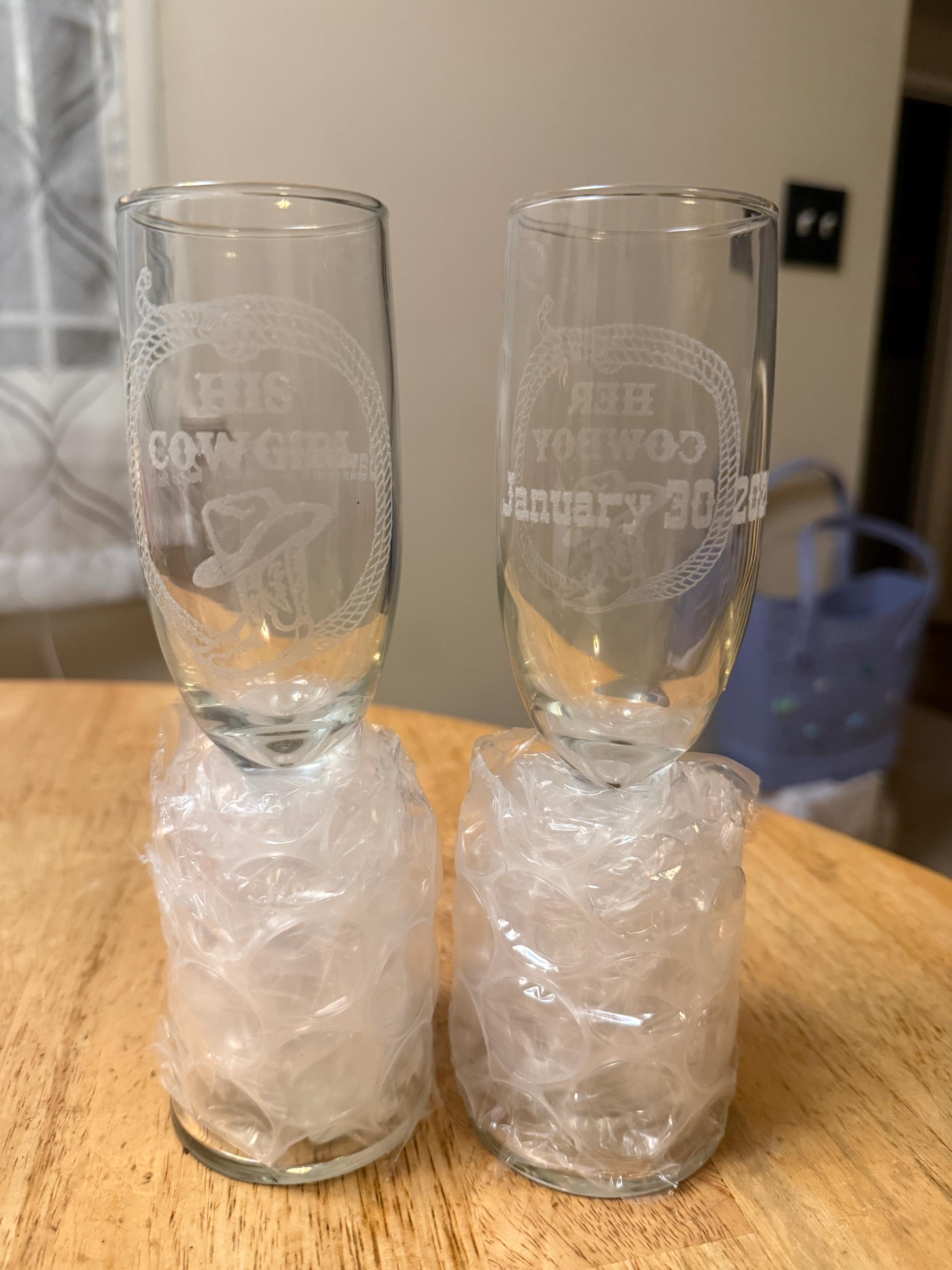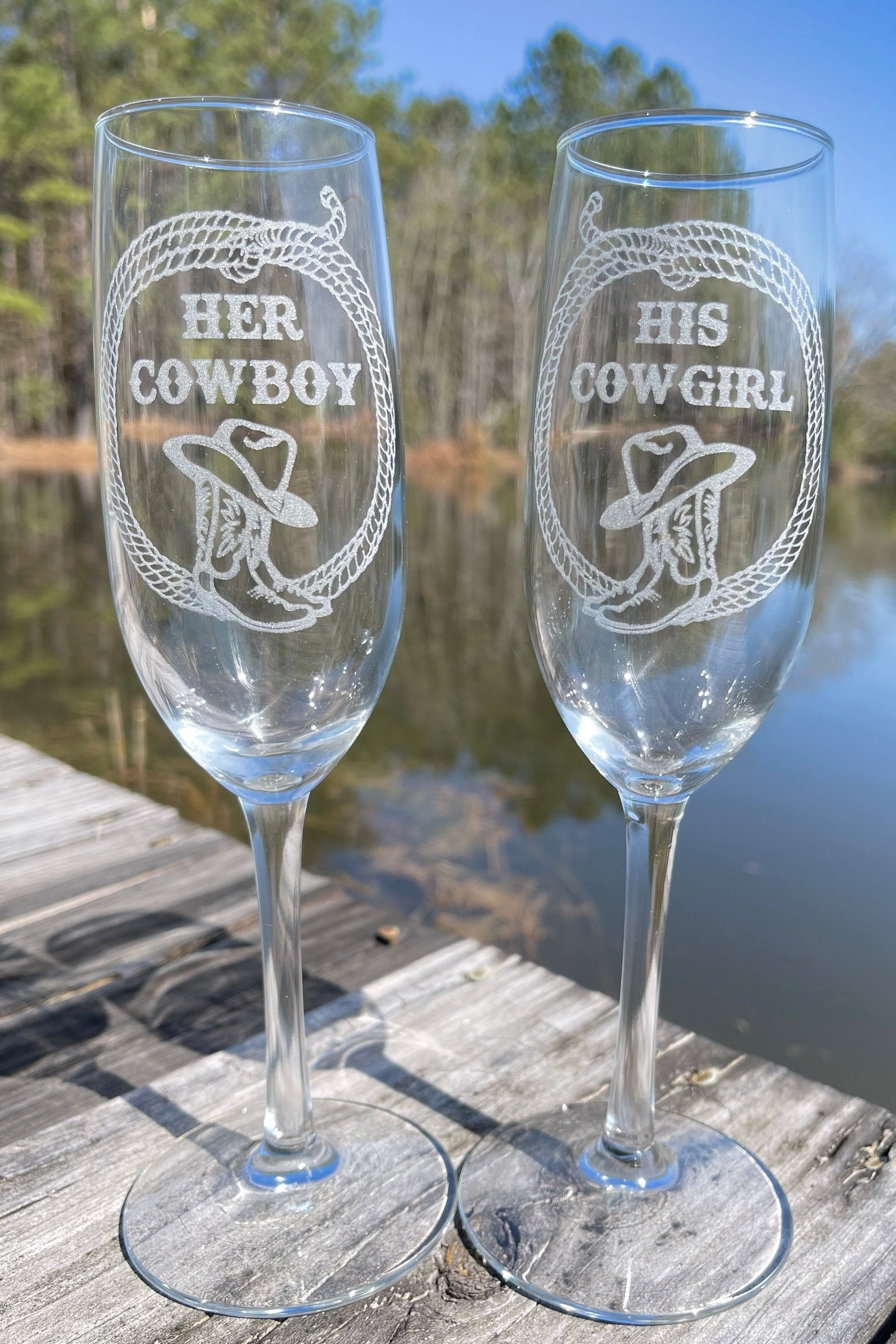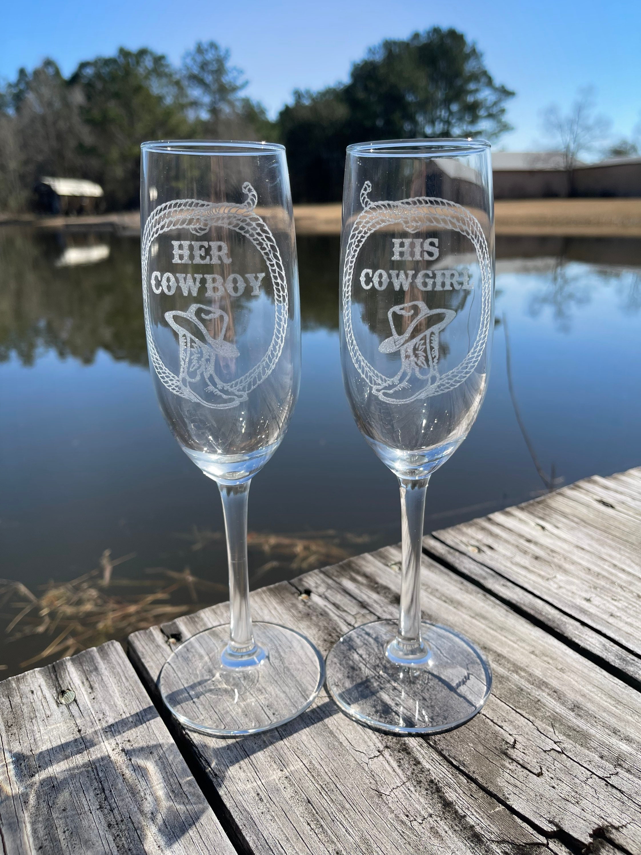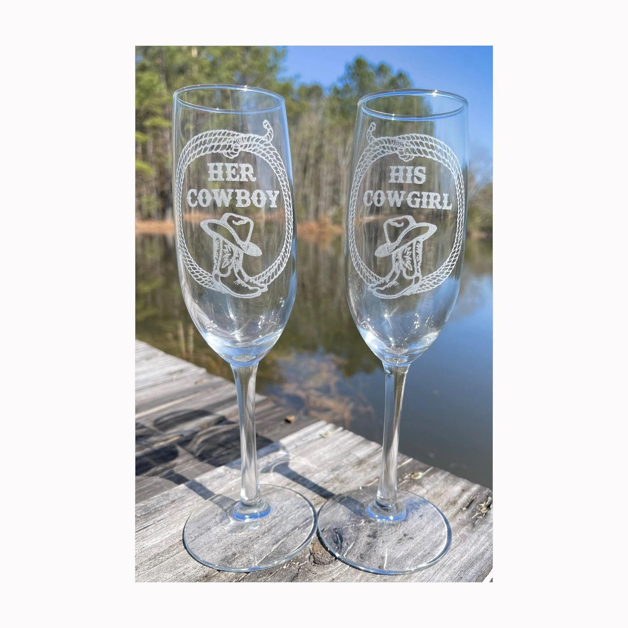 Raise a toast in true western style with this custom-engraved cowboy & cowgirl champagne flute set — perfect for weddings, anniversaries, engagement celebrations, Valentine’s Day, or any special moment worth celebrating! These beautifully etched glasses combine rustic charm with elegant glassware, making a memorable keepsake or thoughtful gift.