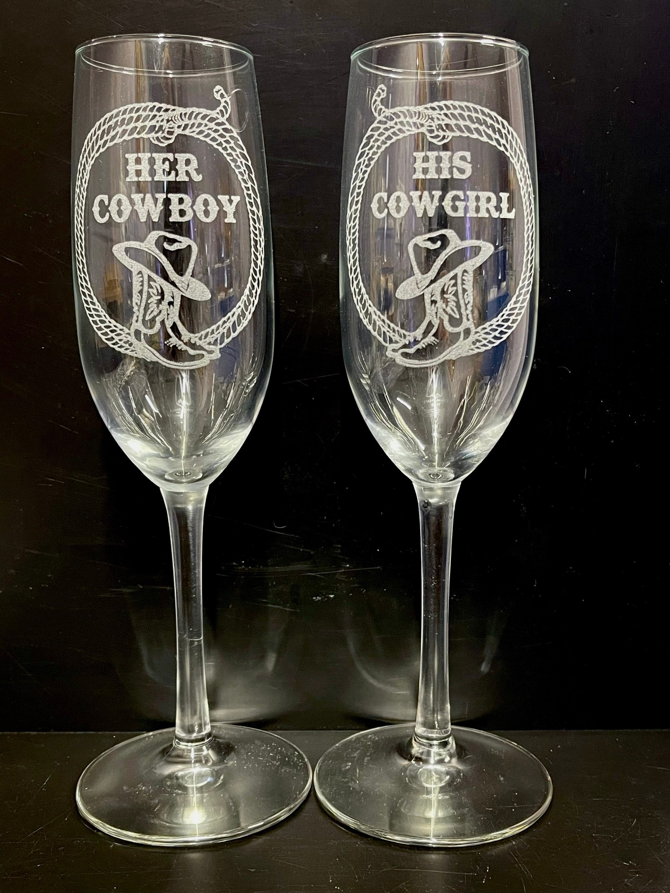 • One flute reads “HER COWBOY”, the other “HIS COWGIRL” (custom text available upon request)