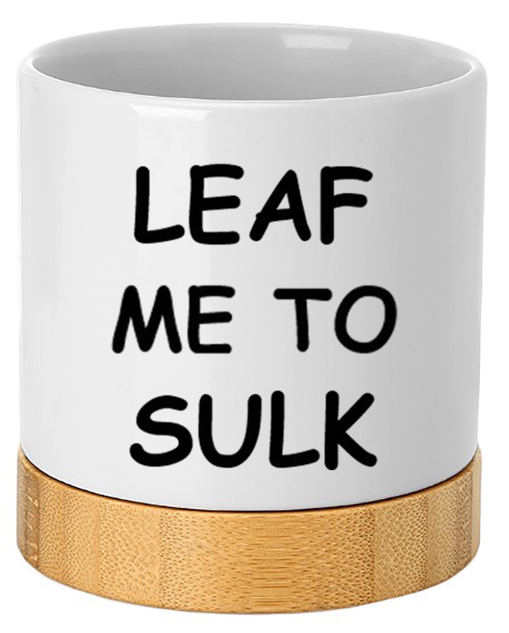 "Leaf me to sulk" This Ceramic Planter with Bamboo Tray Base is perfect for infusing humor and life into any space! The versatile planter is designed to complement any environment or gifting occasion.