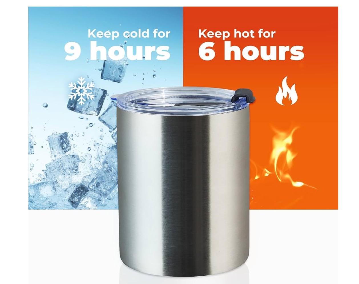 This 12 oz Lowball is the ideal drinking companion, double wall vacuum insulation, enjoy beverage cold or hot. Under normal temperature, it can keep a tumbler of ice cold for 9 hours until the ice totally melt, or hot coffee warm for 6 hours.
