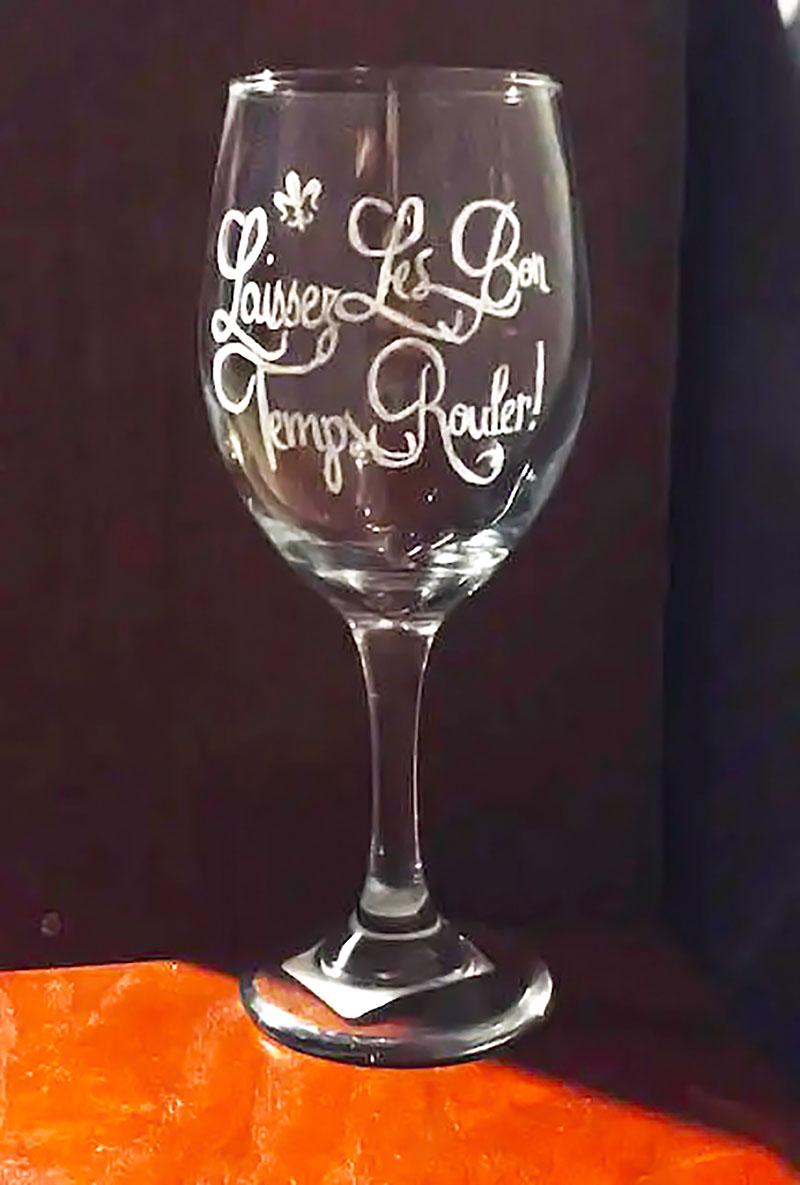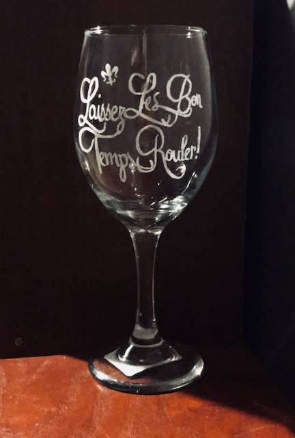 This elegant Wine Glass features the engraved phrase along with a small Fleur de lis which is a symbol that is deeply ingrained in Louisiana's history.