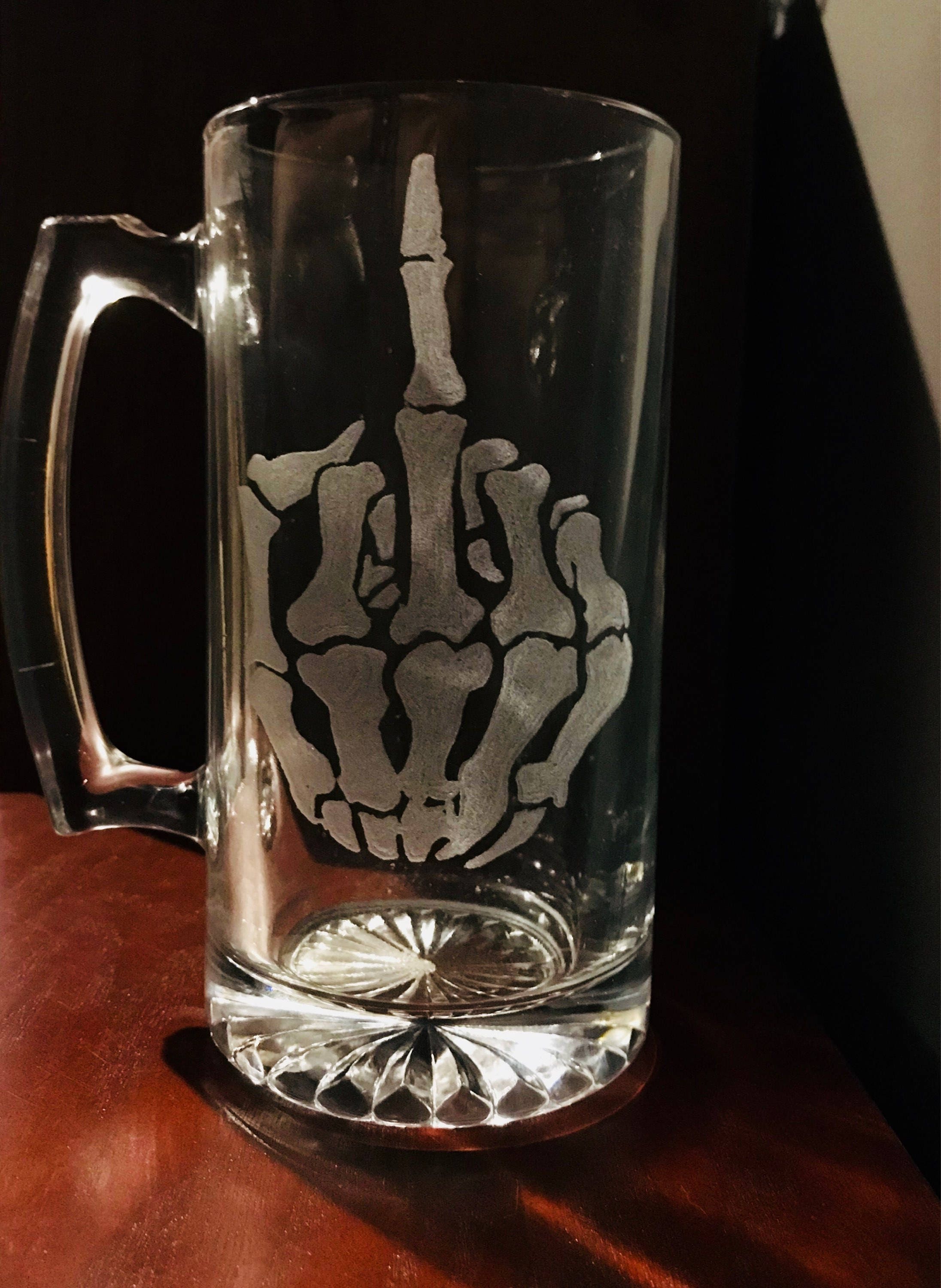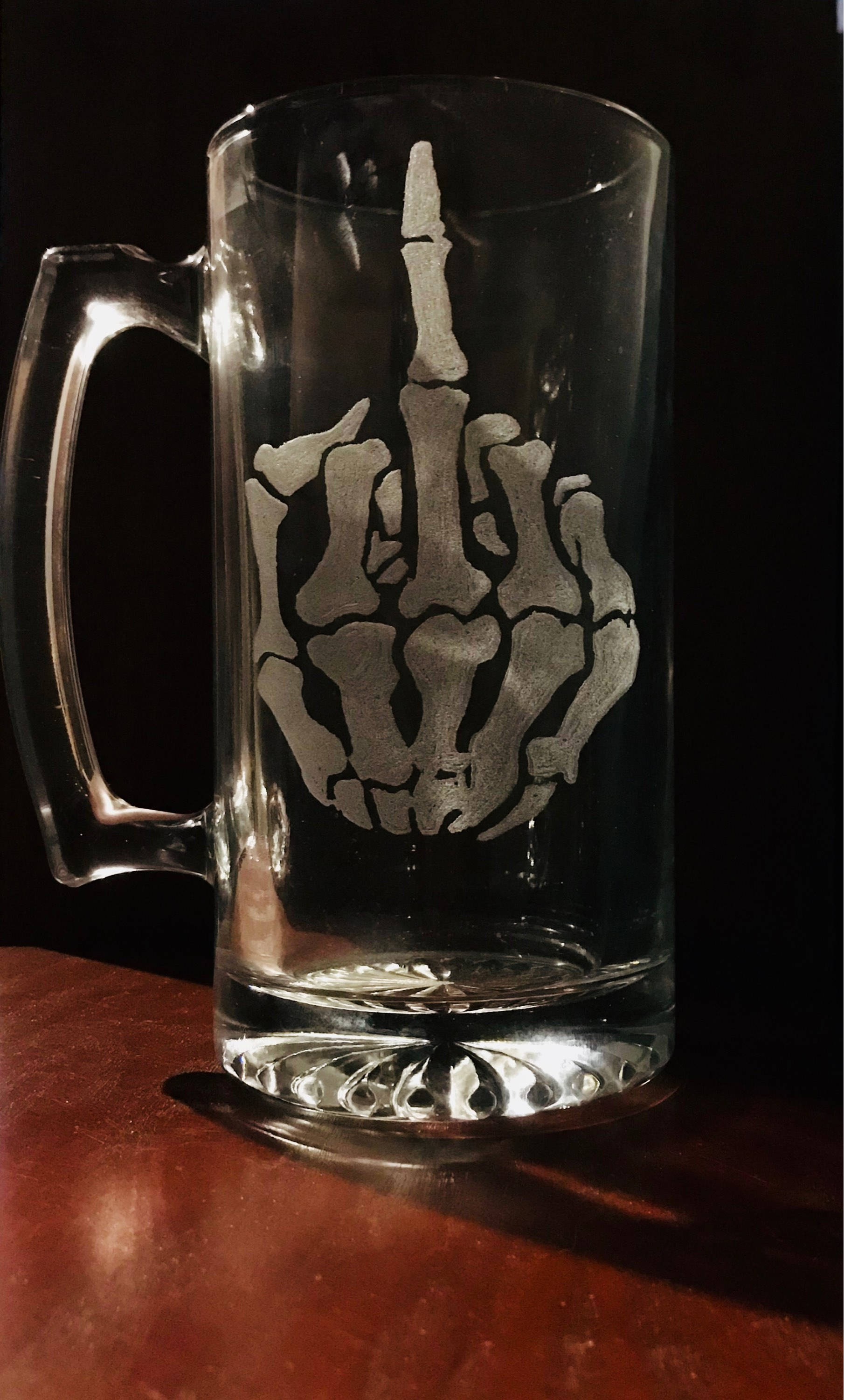 Giving someone the middle finger never felt better than with our skeleton hand Up Yours thick, high quality glass mugs that are made to last. These mugs are 16 oz, and are perfect for every occasion.