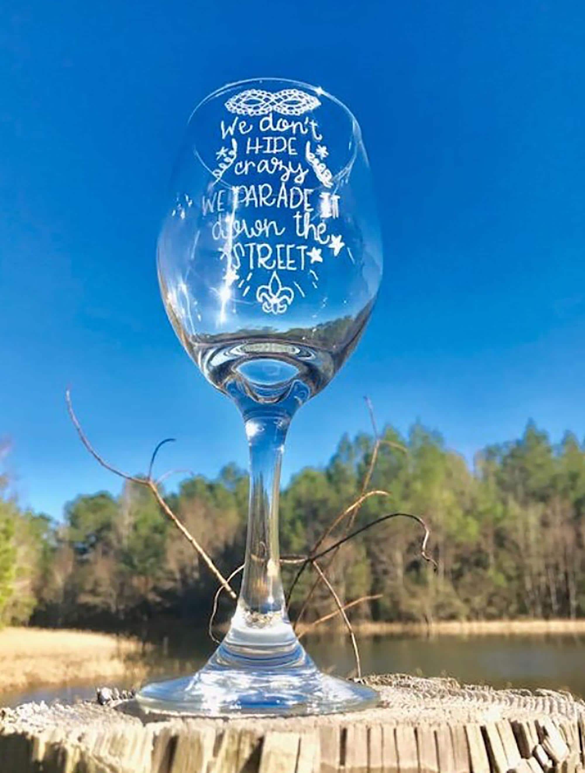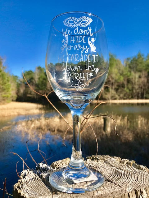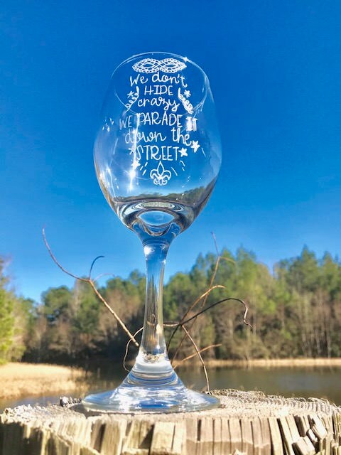 Oh Sha! Ya Mama and dem gonna love this hand engraved wine glass for Mardi Gras! You know dat's tru!