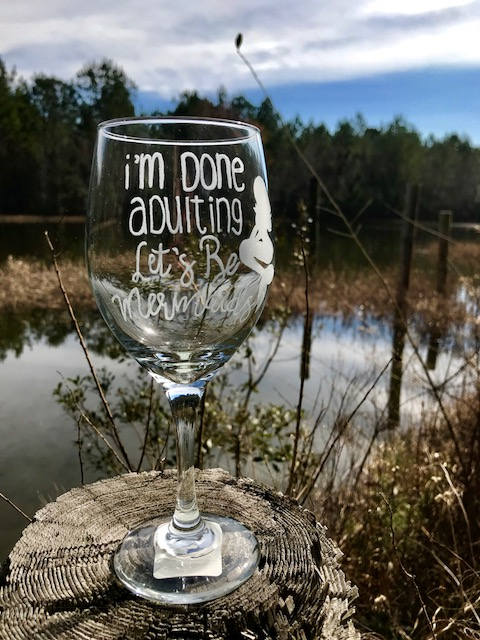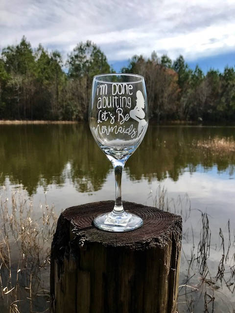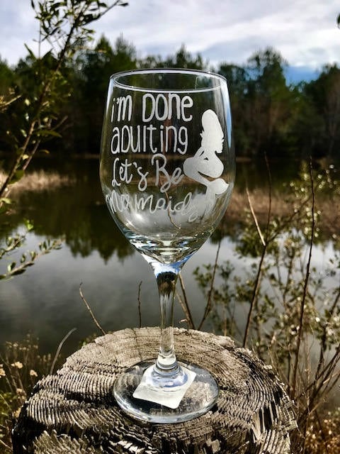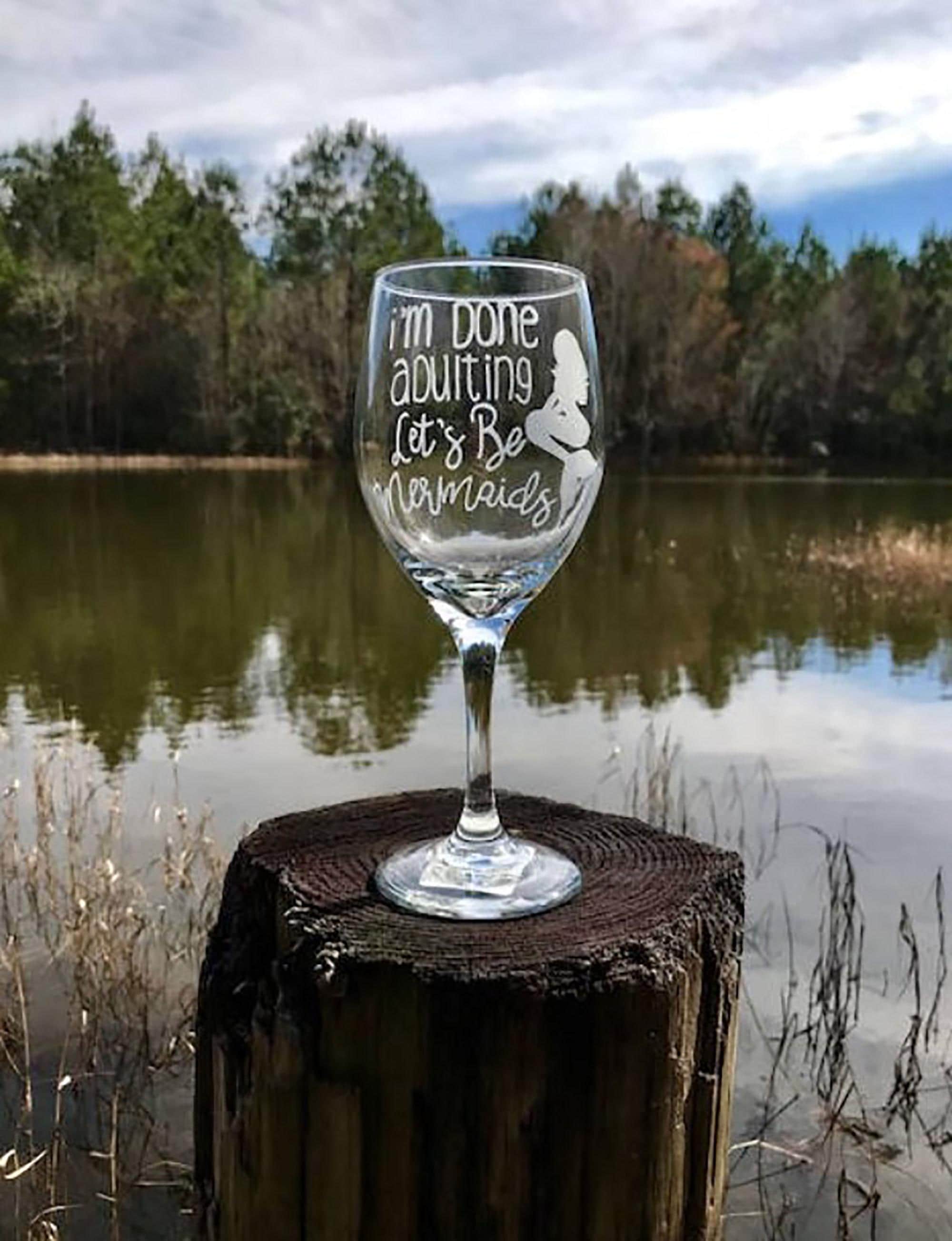 Any mermaid at heart will appreciate this hand engraved, 14 oz wine glass , as well as the sentiment: "i'm done adulting let's be mermaids."