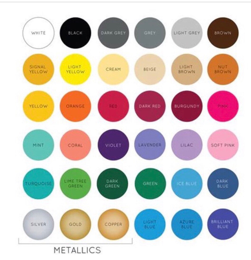 Available in black, white, red, green, blue, pink, purple, orange, yellow, Gold, and silver