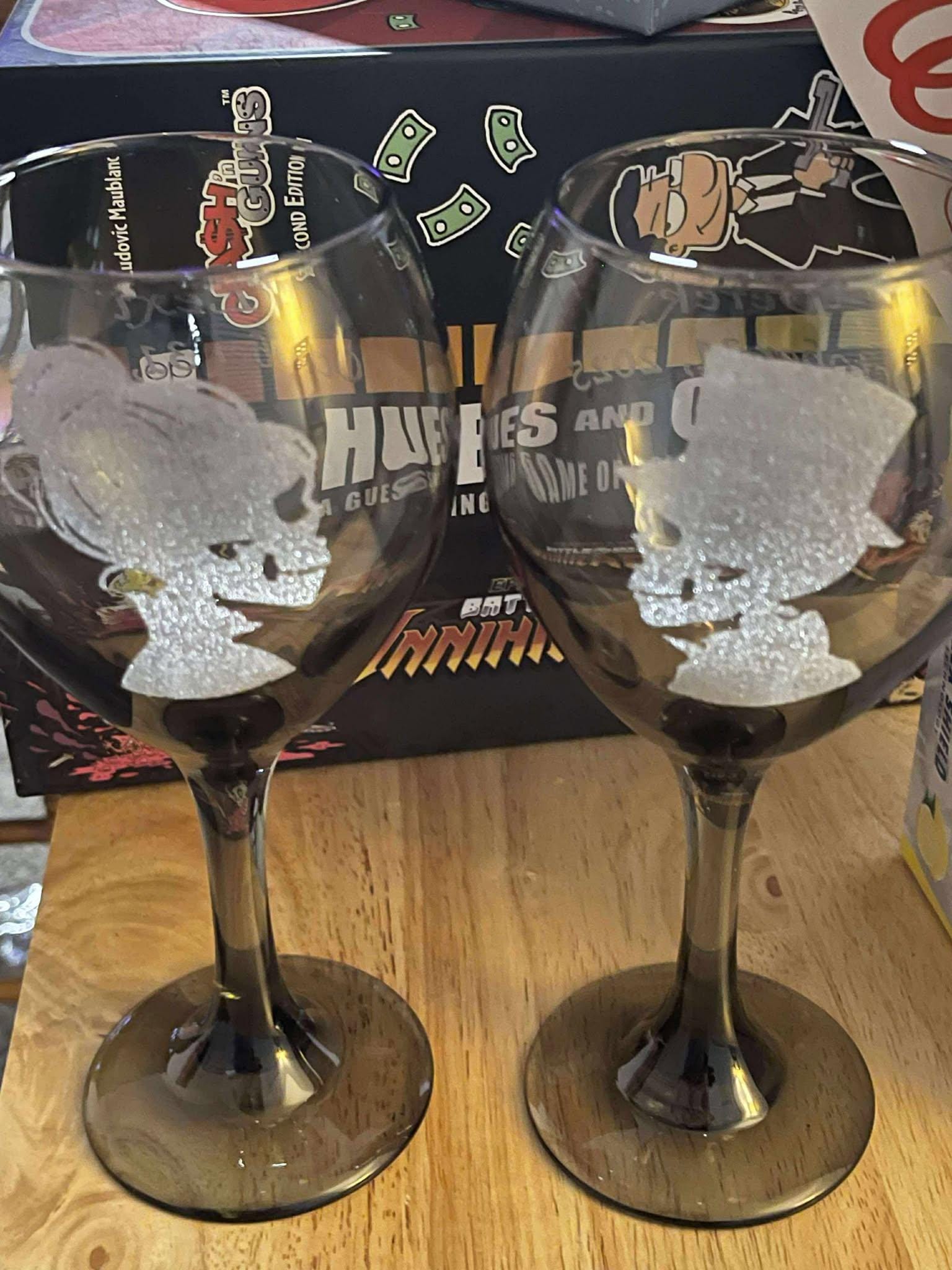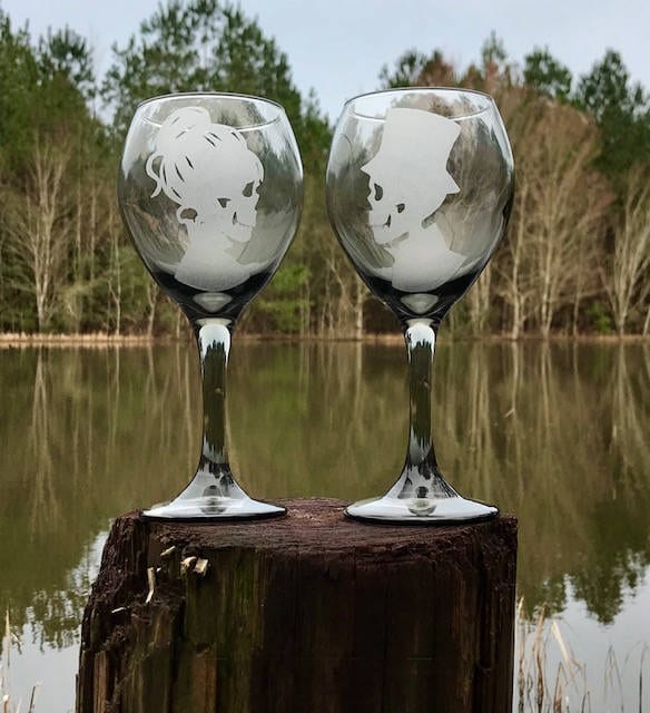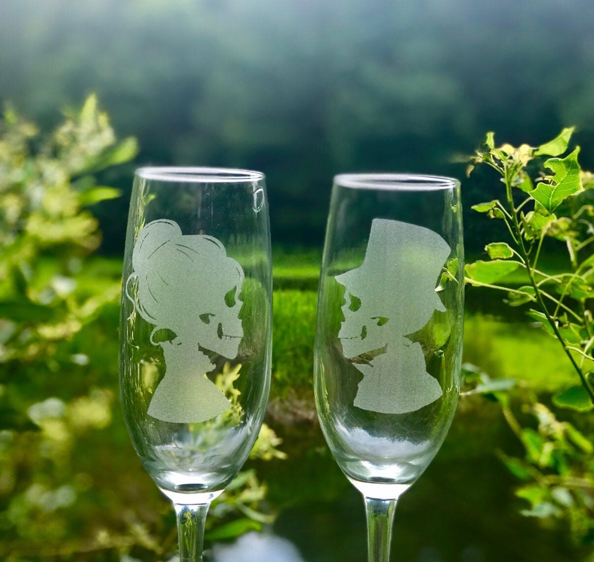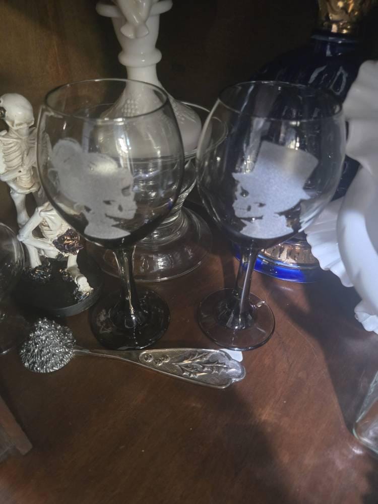 Raise a toast to life (or the afterlife!) with this hauntingly beautiful pair of hand-engraved wine glasses, featuring a skeletal bride with a bun and her groom in a top hat—perfectly pairing gothic romance with elegance.