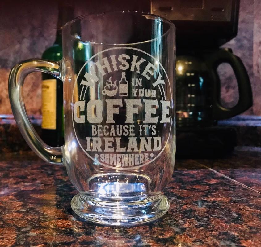 This fabulous mug is the perfect vessel for your favorite warm beverage. The artwork depicts a humorous quote "Whiskey in your coffee because it's Ireland somewhere".