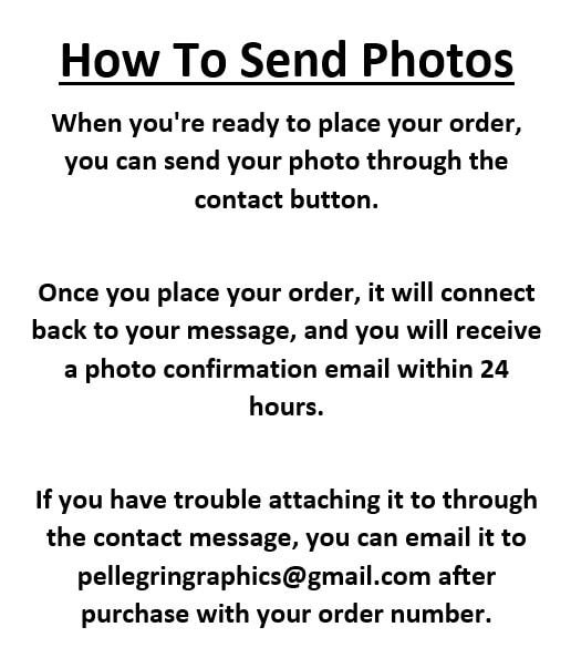Send us your photo via Etsy Messages and it auto connects to your order or email the photo to pellegringraphics @ gmail.com after checkout with your order number.