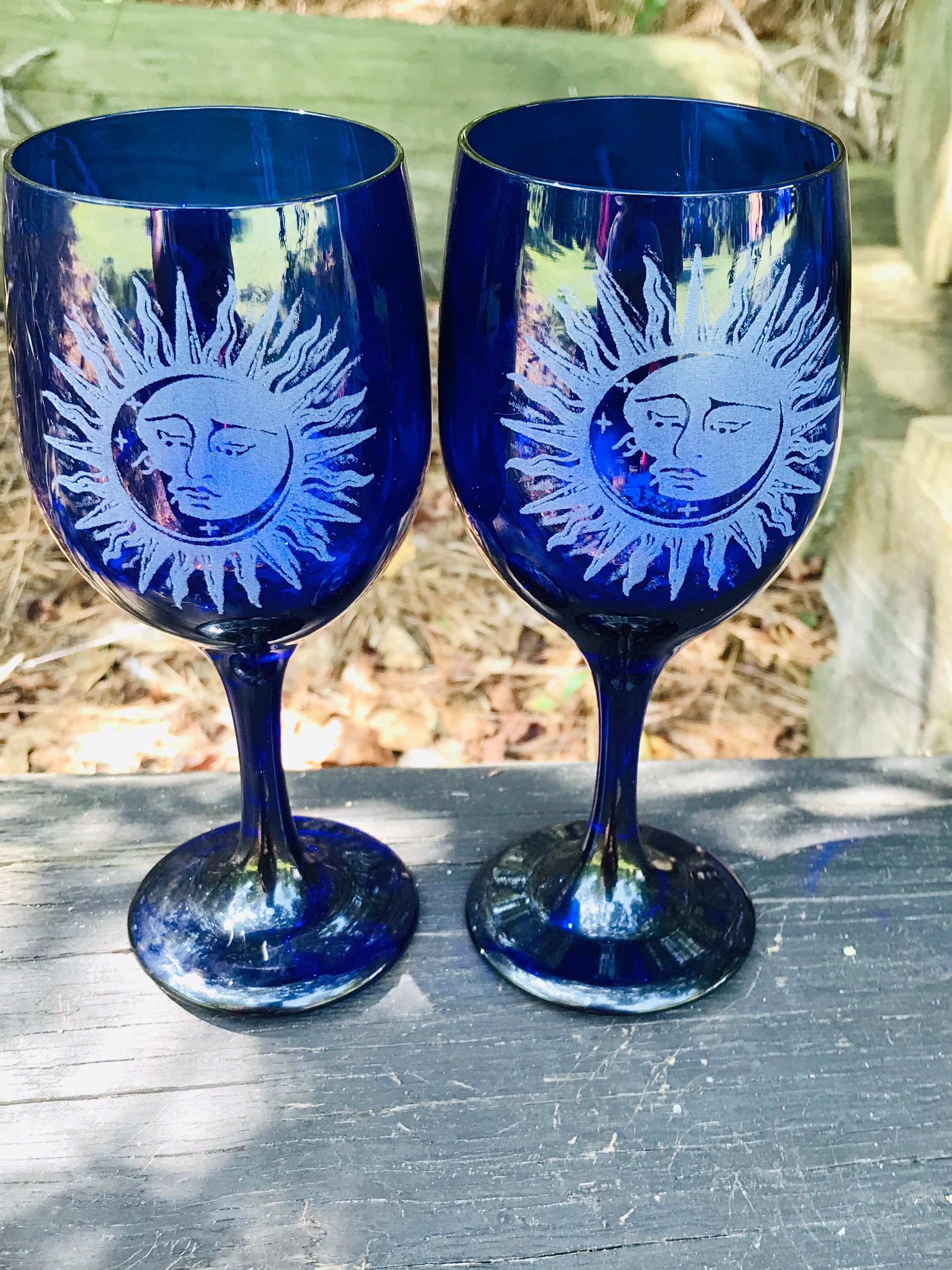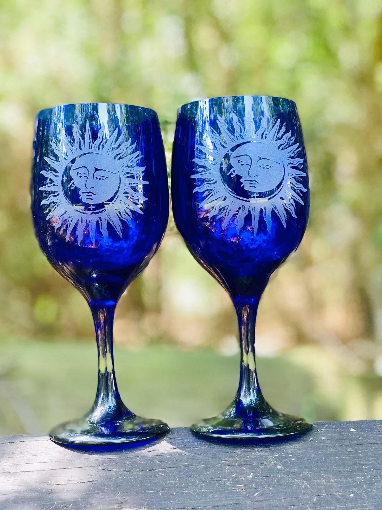 Love is written in the stars! Share a toast with this engraved celestial cobalt blue set if two.
