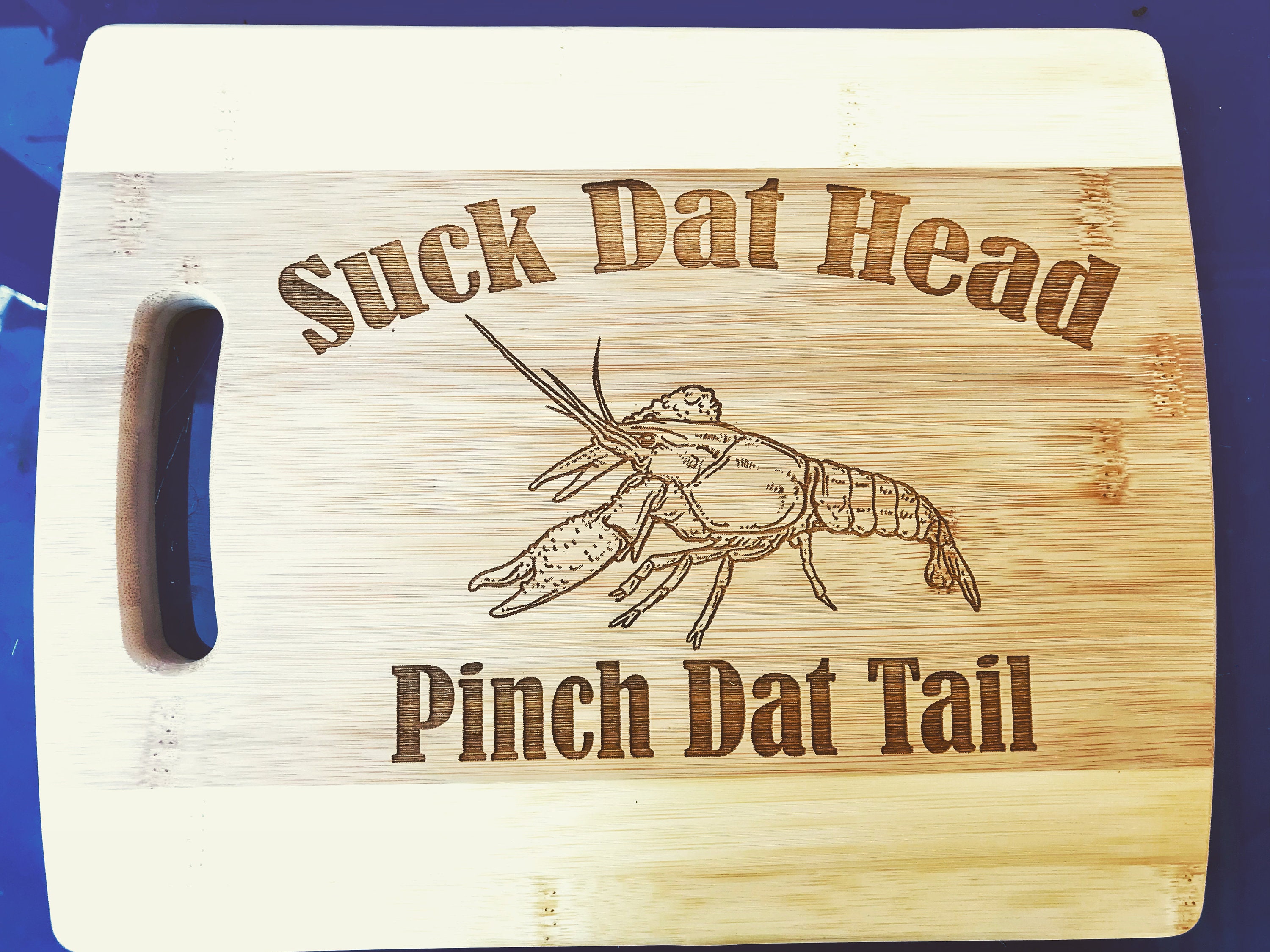 This crawfish cuisine art cutting board is made from all natural bamboo, with the added text Suck Dat Head Pinch Dat tail.